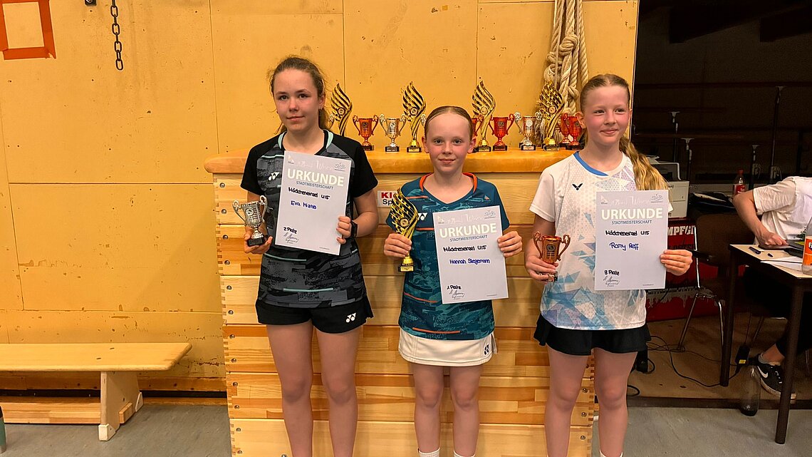 Bei den Offenen Oberhausener Stadtmeisterschaften feierte Hannah Stegemann gleich zwei Turniersiege. Sie setzte sich im Mädcheneinzel U15 souverän durch und siegte im Finale mit 21:10 und 21:11 gegen Eva Mizhis (BC Westfalia Herne). Annelie Tonner konnte sich als Zweite der Gruppe nicht Hauptfeld spielen. Unglücklicherweise hatte sie dort ihr einziges Spiel gegen Vereinskameradin Hannah verloren.