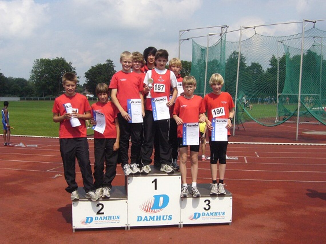 Glänzend aufgelegt zeigten sich dabei einmal mehr die B-Schüler von Union 08, denn in ihrem Wettbewerb holten sich Johannes Overbeck, Benedikt Noll, Hai Nguyen, Julius Heitmann, Luca-Nimo Krebber, Leon Brinkmann, Simon Dabrowski, Sebastian Niehues und Philipp Stejskal mit hervorragenden 3797 Punkten nicht nur unangefochten den Sieg und auch die Qualifikation zur Landesmeisterschaft, sondern katapultierten sich auch in Deutschland ganz weit nach vorne. Ein Blick auf die DLV-Bestenlisten zeigt nämlich, dass die Unionisten mit diesem Ergebnis im letzten Jahr Rang eins und 2009 immerhin Rang drei in Deutschland eingenommen hätten. Somit dürften sie Ende September ein gehöriges Wort bei der Titelvergabe mitreden.