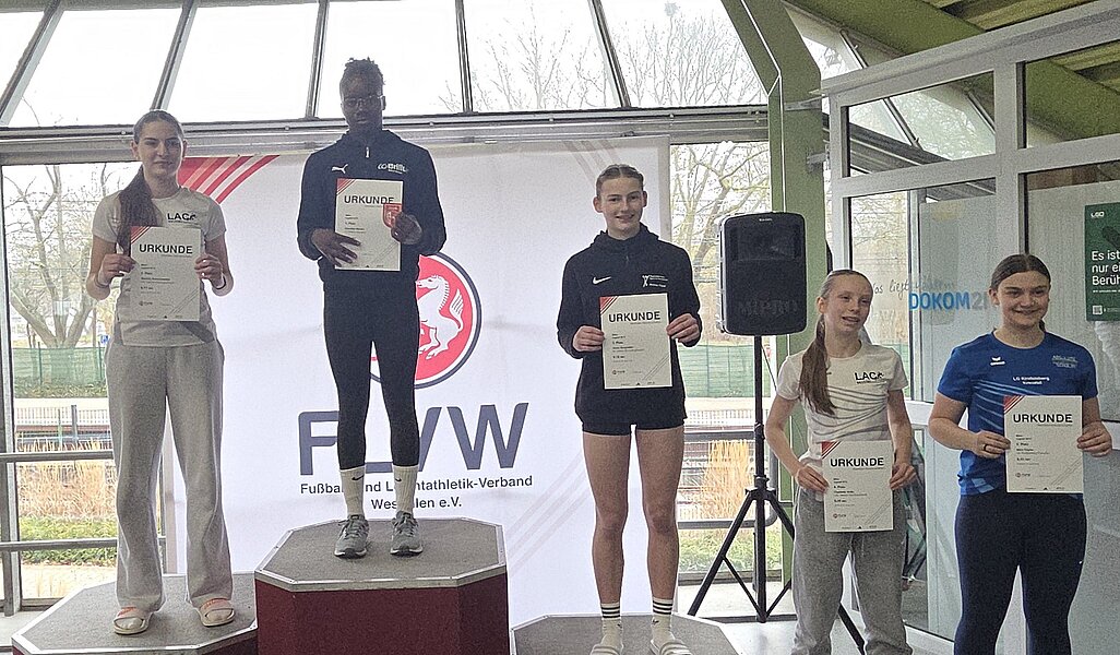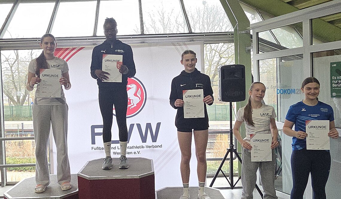 Im Endlauf zeigte Greta Bergkeller schließlich Nervenstärke und konnte ihren guten Vorlauf noch einmal wiederholen. In einem spannenden Finallauf entwickelte sich hinter der überlegenen Münsteranerin Graciete Ntemo, die als einzige unter 8 Sekunden blieb, ein spannender Zweikampf zwischen Bergkeller und Matilda Bretschneider vom LAC Veltins Hochsauerland. Am Ende trennten beide gerade einmal eine Hundertstelsekunde, wobei die Hochsauerländerin knapp vorne lag. Ihre Zeit 8,17 sek und Bergkeller 8,18 sek, womit die junge Unionistin erstmals bei Landesmeisterschaften auf dem Treppchen landete.